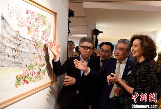 图为联合国教科文组织总干事阿祖莱当天观看活动展览。