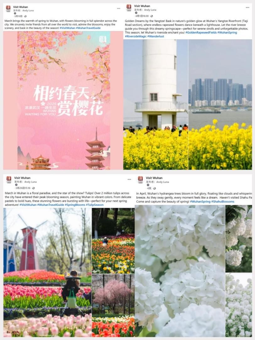 1. 春季传播矩阵。在春意盎然的时节,“Visit Wuhan”围绕“赏花+城市风貌”主题,推出“2025 Romantic Wuhan Blooming All the Way(2025浪漫武汉一路生花)”系列内容,以“花”为信使让城市走向世界。此外,“Visit Wuhan”充分发挥图文与短视频的传播优势,陆续发布多个赏花主题帖文,形成“云赏花”体验。内容涵盖东湖樱花、解放公园郁金香、月湖公园绣球花,江滩油菜花等热门赏花地。令人心旷神怡的的画面和生动解说,吸引大量海外网友驻足点赞、转发、评论。