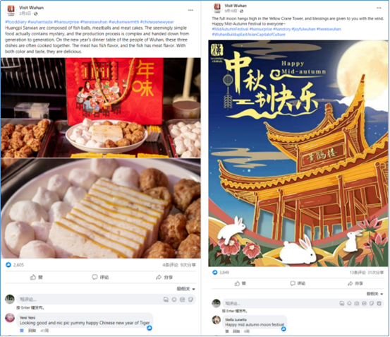 2.利用传统节日营销。传统节日是民族精神及文化底蕴的写照,武汉文旅利用春节、劳动节、国庆节等重大节假日,通过主题内容原创、图片视频视觉规划、专题线上互动活动等形式,将武汉深厚文化底蕴和精髓向海外进行传播,在展示武汉文旅特色的同时,借势节假日进行话题营销,吸引海外用户关注和持续互动,并带动武汉文创产品的消费意向。