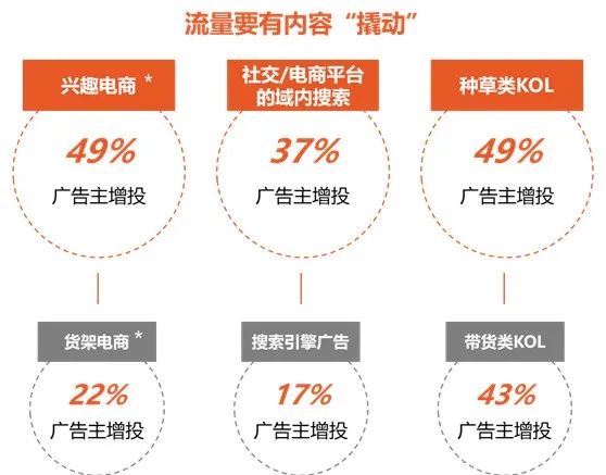 如今,内容为王已经不再是一句口号,而是可以付诸实践并可衡量的。广告主认为内容可以为流量注入“温度”,内容与流量也可以形成高度融合,在付费流量投入产出不尽如人意的情况下,可通过有温度的内容、适配的平台或KOL实现内容与流量的联动。报告显示,在兴趣电商、社交/电商平台内的域内搜索、种草类KOL等具有内容属性的流量平台或营销方式上,广告主有明显的增投态势。