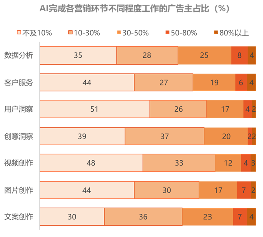 AI技术正在引发营销全链条变革,在消费者洞察、流程自动化以及全链路智能化等领域中得到广泛应用。广告主各个营销环节都不同程度有AI来赋能,其中过半广告主表示其由AI完成的营销工作已超10%。AI应用已经进入快速普及和实践应用阶段,人机协同的关系正逐渐深化。广告主正在AI基建、战略方向、组织建设、场景实践和合法合规方面加速布局,抢占未来发展先机。例如,有广告主谈到公司正在筹备需求会,会将AI应用从客服层面转到更业务、更加创新的方向。
