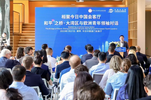 7月27日,相聚今日中国会客厅——和平之桥·大湾区与欧洲青年领袖对话活动在广东横琴粤澳深度合作区举办。中国人民对外友好协会会长杨万明、中国外文局局长杜占元作视频致辞,世界青年领袖论坛主席雅各布·加西亚现场致辞。活动现场,今日中国澳门会客厅还专门设了小型非遗展览,邀请了多位非遗传承人现场展示和分享。本次活动以“青年创和平,科技向未来”为主题,由中国人民对外友好协会、中国外文局共同举办,中国外文局西欧与非洲传播中心(今日中国杂志社)承办,广东省人民对外友好协会协办。中国外文局西欧与非洲传播中心(今日中国杂志社)副主任李效华主持活动。中欧青年及各界代表80余人参与活动。